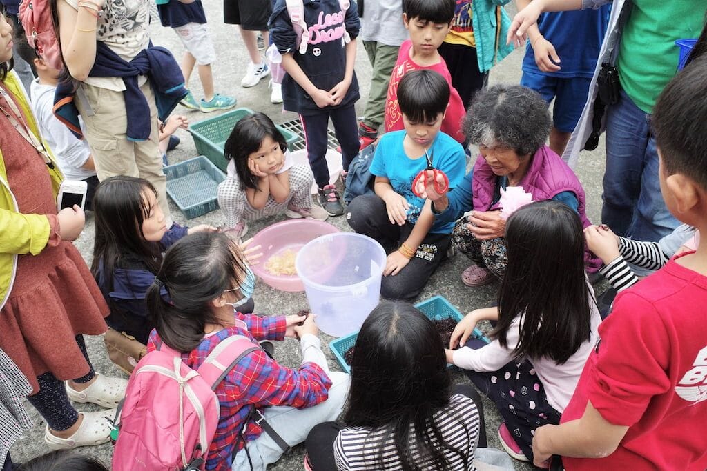 接著,還當了海女阿嬤的助手,剪、洗、曬石花菜,才知道行前點心社煮的石花菜,原來,要經過洗、曬七回合,才能把紅色洗去,成為白色。然後,跟著海女阿嬤到她平常工作的潮間帶⋯⋯想當然地,瞬間,這裡變成孩子的遊樂場,在陸地與海的交界,孩子們玩得不亦樂乎!