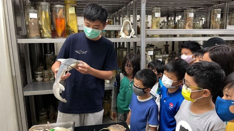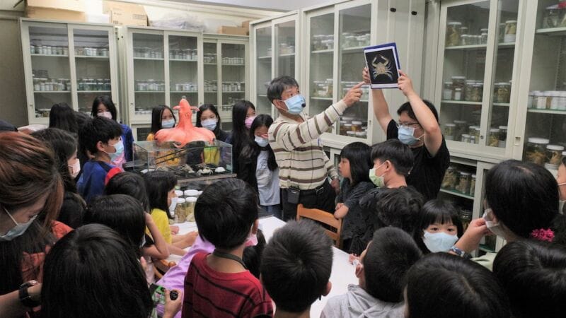 然後,把觸角伸向海洋,近80個人,就來到海洋大學漁學館,聽聽「標本鯊魚」可以告訴我們什麼?(天哪!有種鯊魚竟然八千萬年前就有了!);再看看甲殼類,小小的台灣,竟然有超過全世界的十分之一的種類(八百多種)。