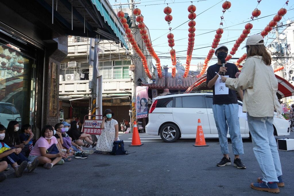 然而,適逢今日仁和宮舉行法會,我們索性轉移到媽祖大樓前的空地,開場由老師進行短劇的演出,緊接著進行一連串的提問,一群人在廣場上的模樣,不禁讓人想到1925年在同樣地點所舉行的農民大會,是不是也像這樣的場面?在另一處的武德殿,同時也有一群師生在認識著這棟具有象徵性意義的歷史建築,試著思索這些場景和近百年前的這場事件,有著什麼樣的關聯性。