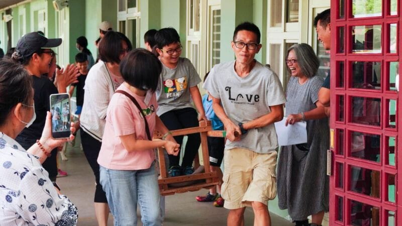 開學第一關,爸媽合力將孩子送入學校 遠遠聽到行李箱的聲音,接著看到爸爸媽媽推著一個行李箱,哇!上面坐著一個大男生啊!而且大聲疾呼著:「我來了!」接下來居然看到兩個爸爸扛著木轎子,又看到一對爸爸媽媽用花轎抬著一個又高又壯的大男生啊!